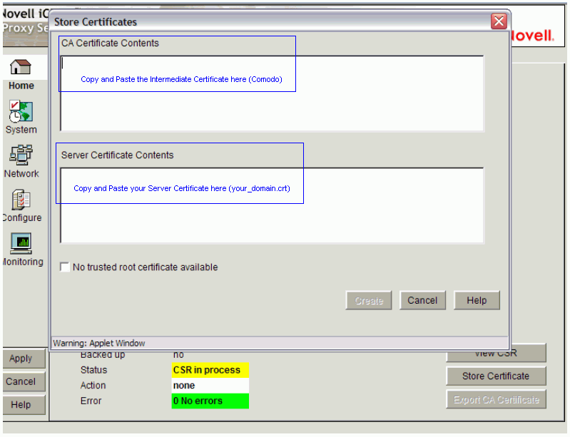 You may get an error stating that the subject in the certificate does not match the subject in the object (CSR). This will be due to additional OUs in the certificate. Accept the certificate anyway. If a validation is attempted on the certificate in ConsoleOne it will produce an error stating 'Unable to validate the certificate chain to a root certificate'.